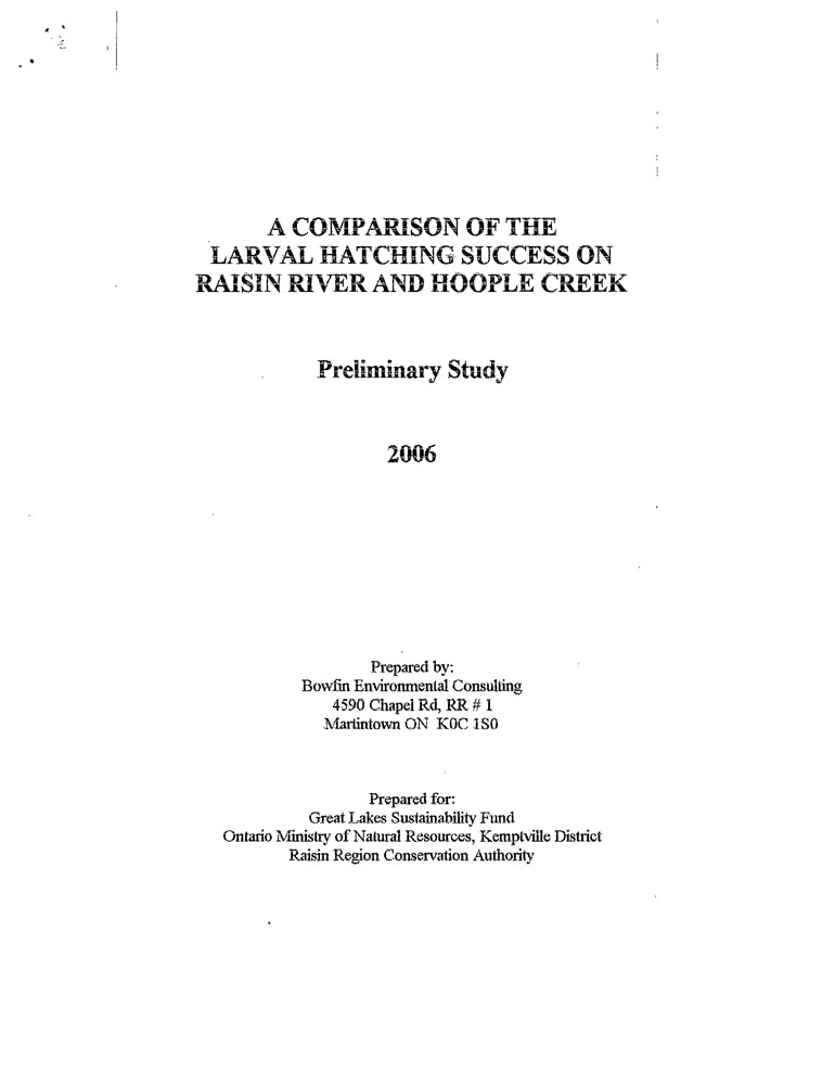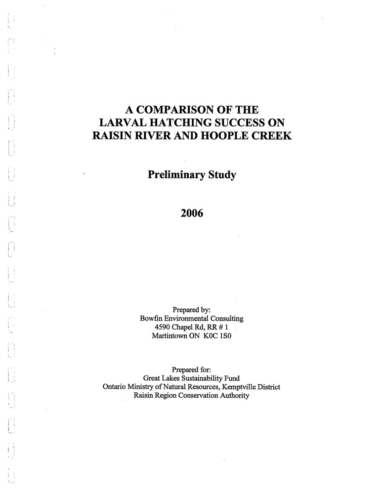 | 0333 | A Comparison of the Larval Hatching Success on Raisin River and Hoople CreekPreliminary Study 2006 | Bowfin Environmental Consulting | 2006 | Stapled |