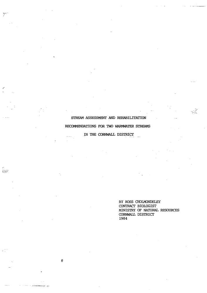 | 0312 | Stream Assessment and RehabilitationReccomendations for Two Warmwater Streams in the Cornwall District | Ross Cholmondeley | 1984 | Duotang |