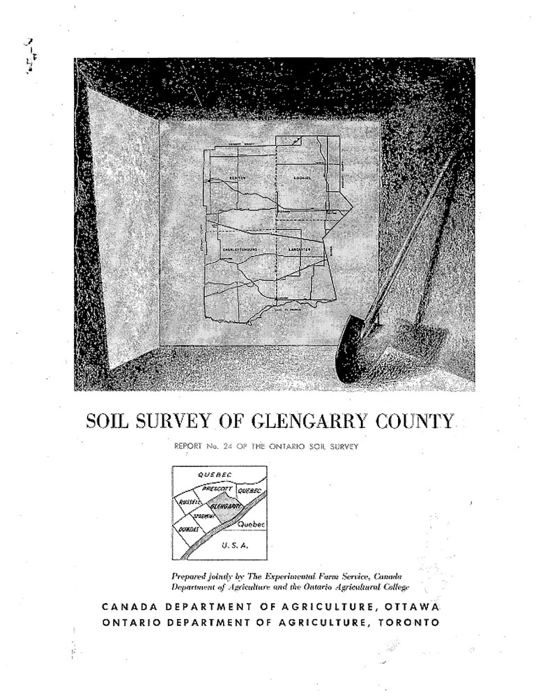 | 0315 | Soil Survey of Glengarry CountyReport No. 24 of the Ontario Soil Survey | B.C. Matthews, R.E. Wicklund | 1957 | Paper clip |