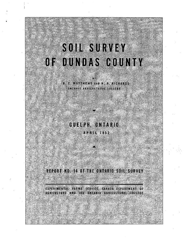 | 0316 | Soil Survey of Dundas CountyReport No. 14 of the Ontario Soil Survey | B.C. Matthews, N.R Richards | 1952 | Stapled |