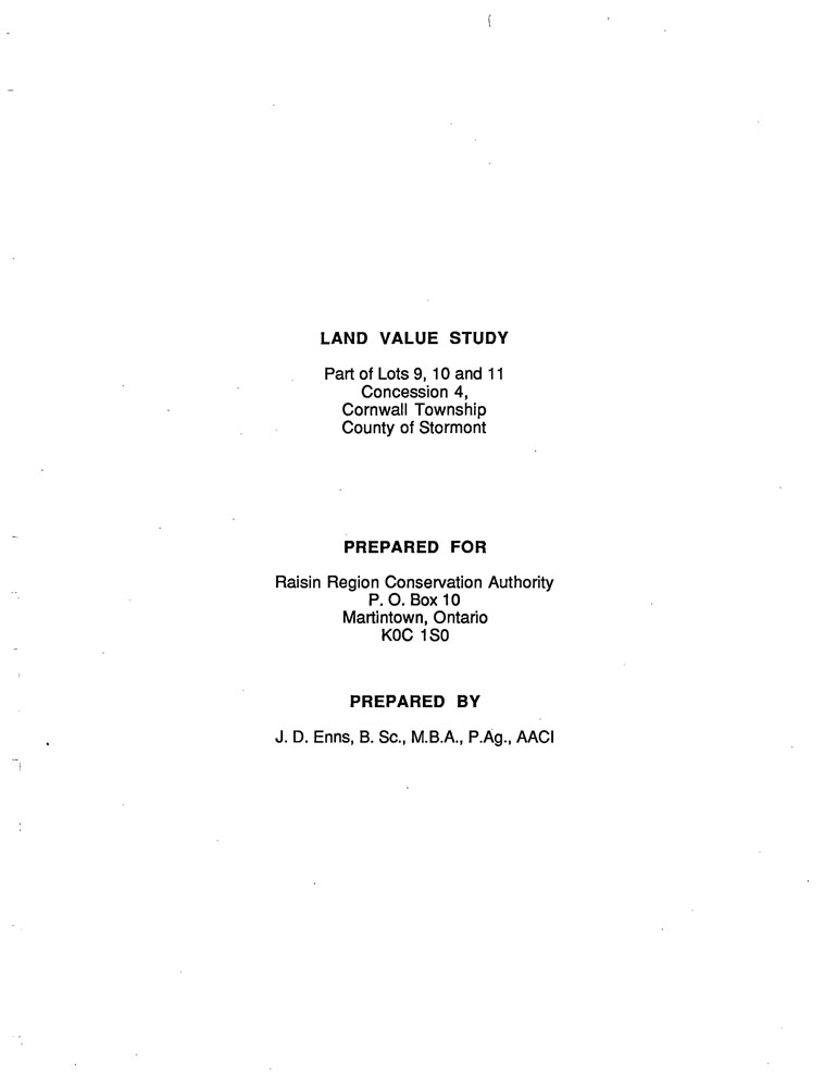 | 0317 | Land Value StudyPart of Lots 9,10 and 11, Concesstion 4, Cornwall Township County of Stormont | J.D. Enns, B. Sc. , M.B.A., AACI | 1988 | Cerlox |