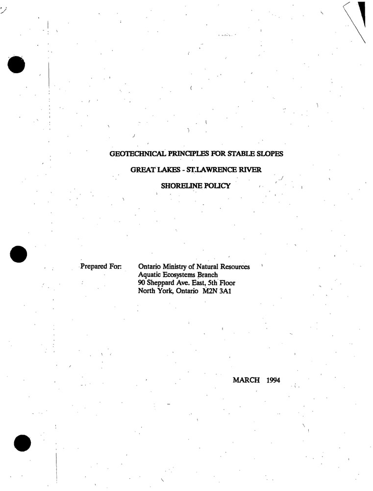 | 0320 | Geotechnical Principles for Stable SlopesGreat Lakes - St. Lawrrence River, Shoreline Policy | Ontario Ministry of Natural Resources | 1994 | Duotang clip |