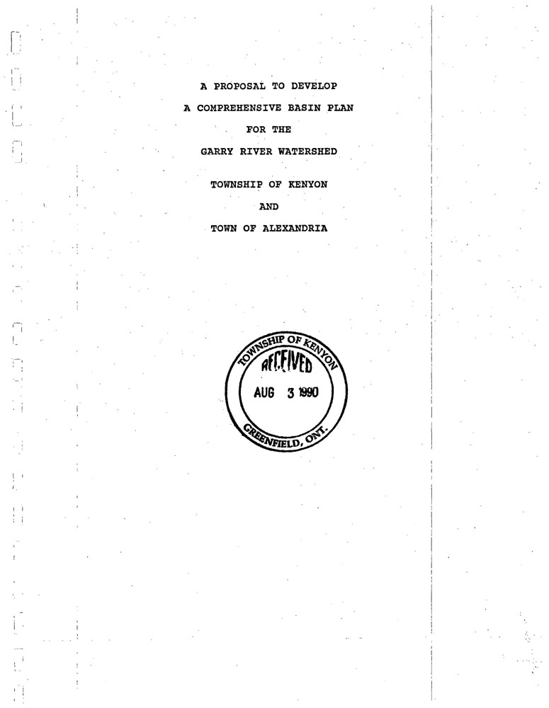 | 0321 | Basin Plan of Garry River WatershedA Study Proposal, Township of Kenyon and Alexandria | Cumming Cockburn | 1990 | Cerlox |