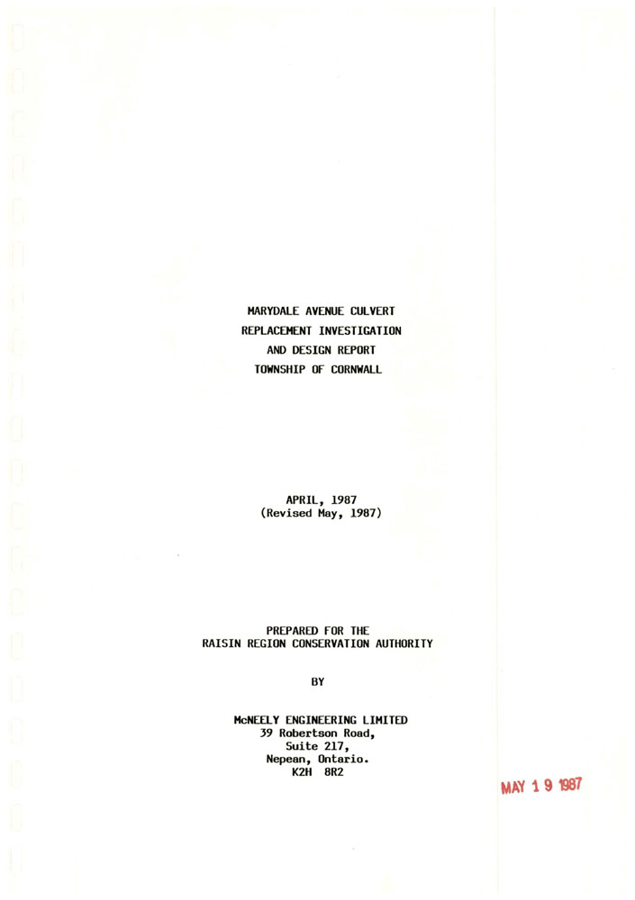 | 0323 | Marydale Avenue CulvertReplacement Investigation and Design Report, Township of Cornwall | McNeely Engineering Limited | 1987 | Cerlox. Attachments: 2 Maps |