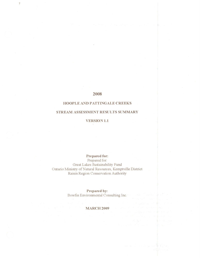 | 0324 | Hoople and Pattingale CreeksStream Assessment Results Summary, Version 1.1 | Bowfin Emvironmental Consulting Inc | 2009 | Paper clip |