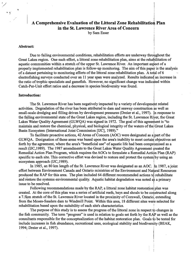 | 0332 | A Comprehensive Evaluation of the Littoral Zone Rehabiliation PlanIn the St. Lawrence River Area of Concern | Sam Esser | 2005 | Stapled |