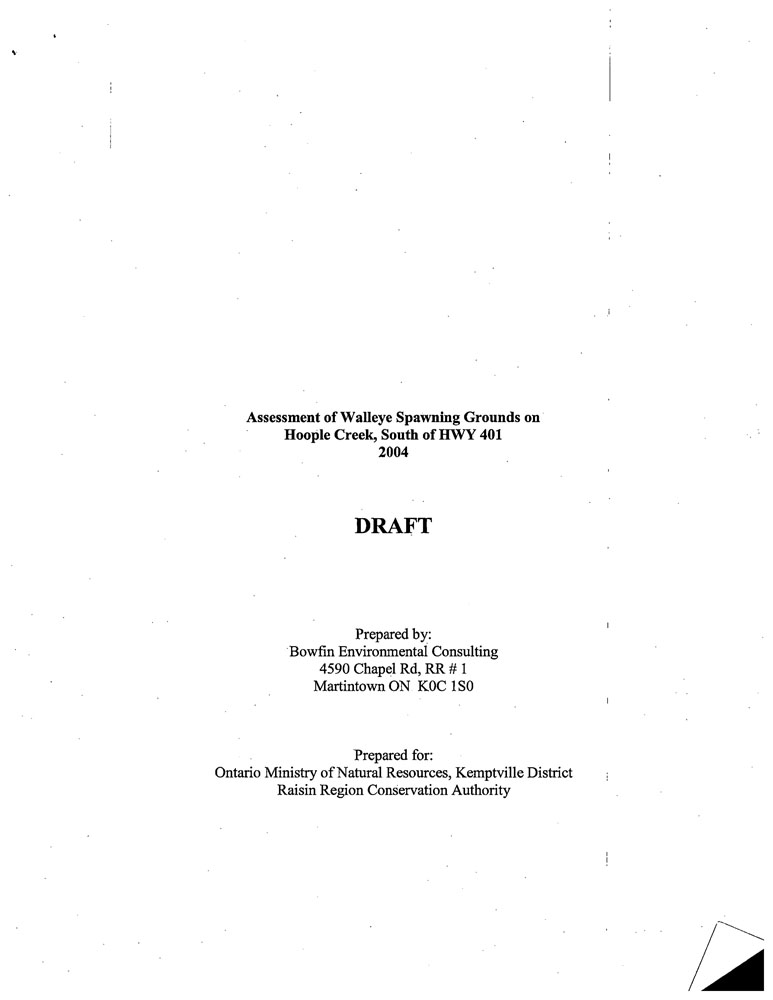 | 0336 | Assessment of Walleye Spawning Grounds on Hoople Creek, South of HWY 401 2004Draft | Bowfin Environmental Consulting | 2004 | Stapled |